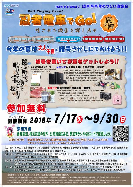 芭蕉が忍者であったという説を生かし、公共交通機関(養老鉄道・樽見鉄道・JR)を使った、子どもから大人まで誰もが好きな時間に冒険ができる、忍者文字(暗号)を使った財宝探しアドベンチャーを実施します。