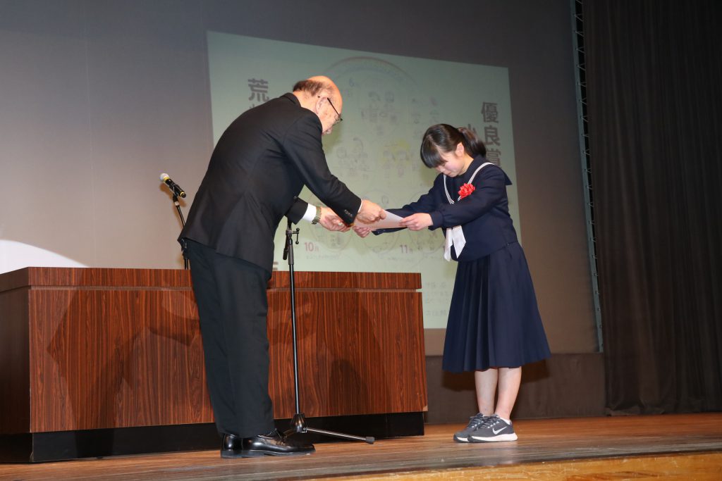 大会は、大垣女子短期大学OGグループ「みずきの会」による音楽演奏で幕を開け、青少年および青少年育成者(団体)の会長表彰、わが家のふれあいアルバムの優秀作品表彰に続き、市制100周年を記念し、小中高校生から「みんなで描こう未来の大垣」をテーマに募集した作文コンクールの優秀作品(小学生の部 3人、中学生の部3人、高校生及び一般の部3人)の表彰、各部門の最優秀者による発表を行いました。