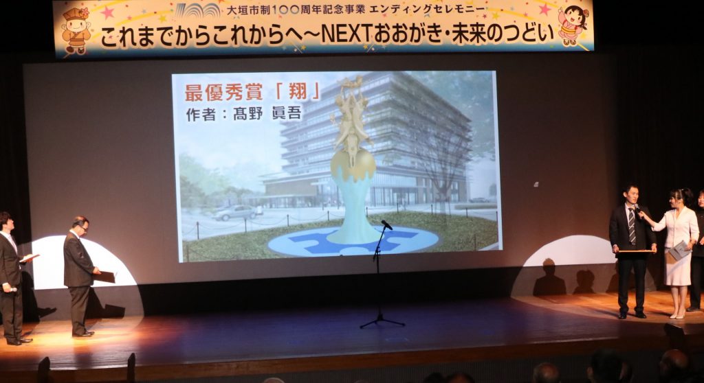 続いて新庁舎シンボルモニュメントの発表があり、髙野眞吾さんの「翔(しょう)」が選ばれました。水資源の豊富な大垣という土地から未来へ羽ばたく子どもたちをイメージした作品とのことで、今から完成が楽しみですね。