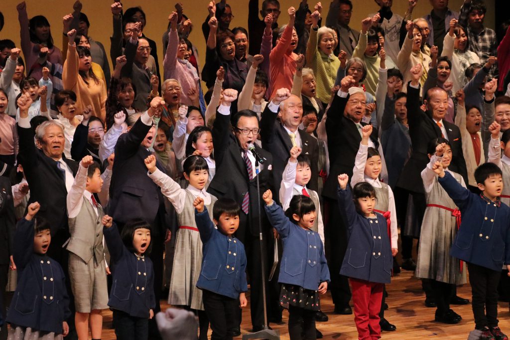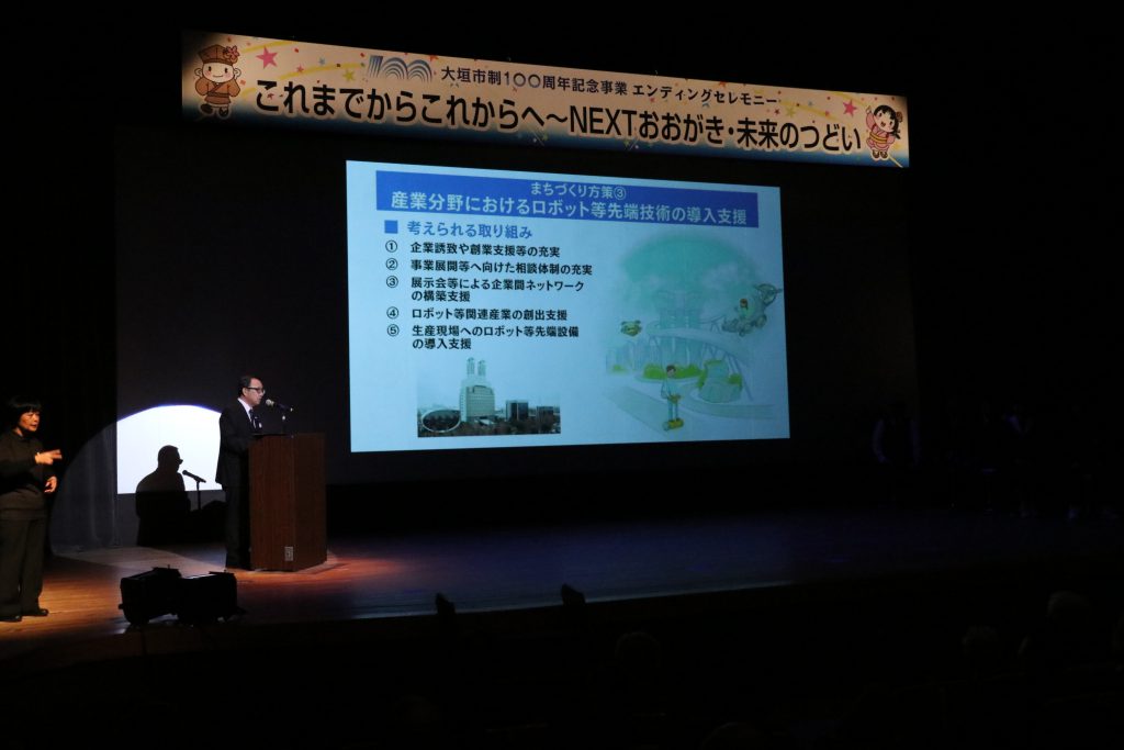 そして、大垣市ロボット等活用まちづくり指針の発表に続いて、大垣市のこれからのさらなる発展を誓う「おおがき未来宣言」と市民公募の合唱団体の皆さんと牧田保育園の園児たちによるおおがきの歌の大合唱でフィナーレを迎えました。まさに、市民が主役の市制100周年の締めくくりにふさわしいセレモニーでした(^-^)